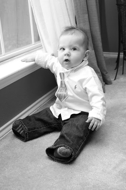 I realized that I never posted my series of "tie pictures" of Beckett. Every month I took a few hundred some pictures of Beckett with a sticker to show his age. For his birthday party I picked a favorite one of each month and created a banner to hang. Actually, I couldn't always choose my favorite because I needed all of the pictures to be portrait style (as opposed to landscape style) for consistency. I also chose to convert them to black and white so that they would look the same. I didn't mess with the anything fancy of the black and whites tones because I just ran out of time, so it's probably not optimal. But, the banner turned out cute and it's something I hope to hang on to for him and plan to embarrass him with proudly display when he graduates high school.